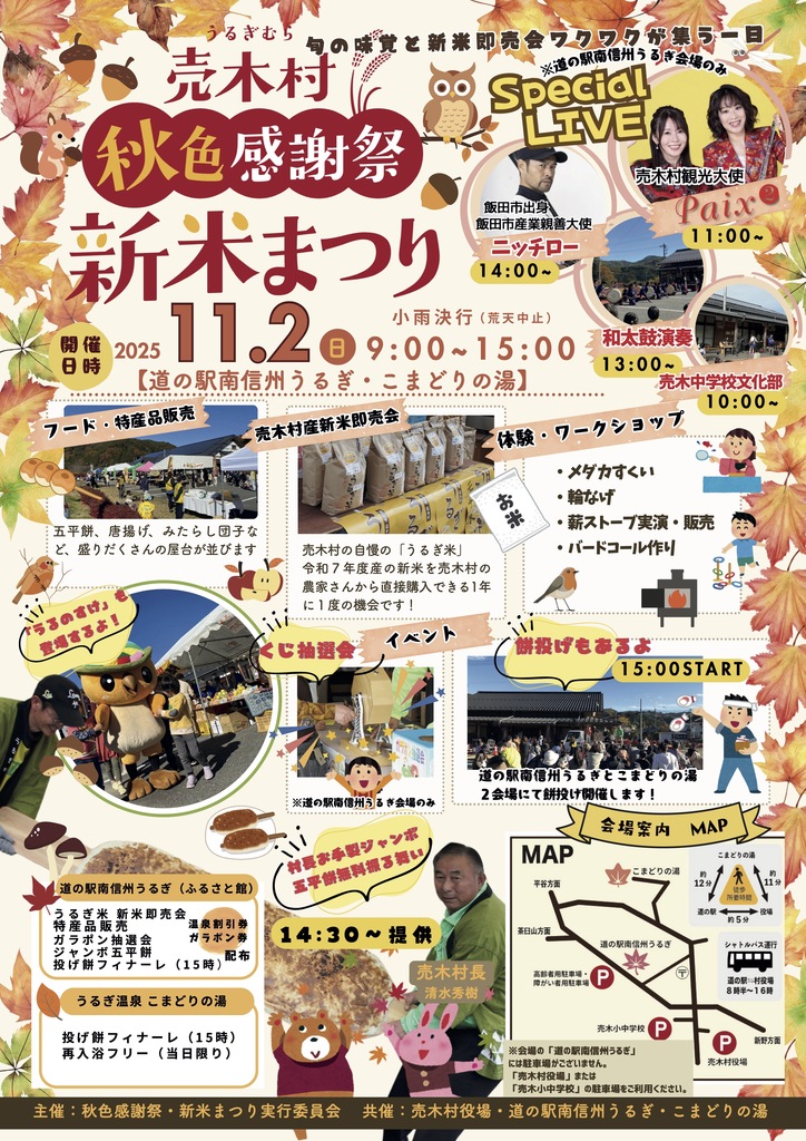 売木村観光大使Paix2(ぺぺ)のミニライブや太鼓の演奏、売木中学校文化部による演奏を行います。また、売木村のイメージキャラクター「うるのすけ」も登場します!