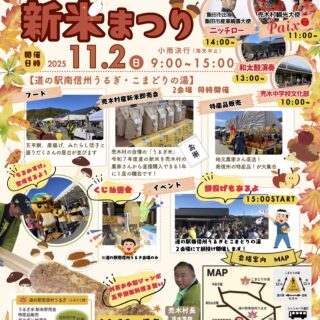 未分類 2025 秋色感謝祭・新米まつり開催について 道の駅南信州うるぎにて、秋色感謝祭&新米まつりを開催します。旬の味覚と新米即売会!ワクワクが集う一日。ぜひお越しください!!開催日時:令和7年11月2日(日)9:00~15:00会場:道の駅南信州うるぎ(うるぎふるさと館)・温泉こまどりの湯... 2025.09.24 未分類